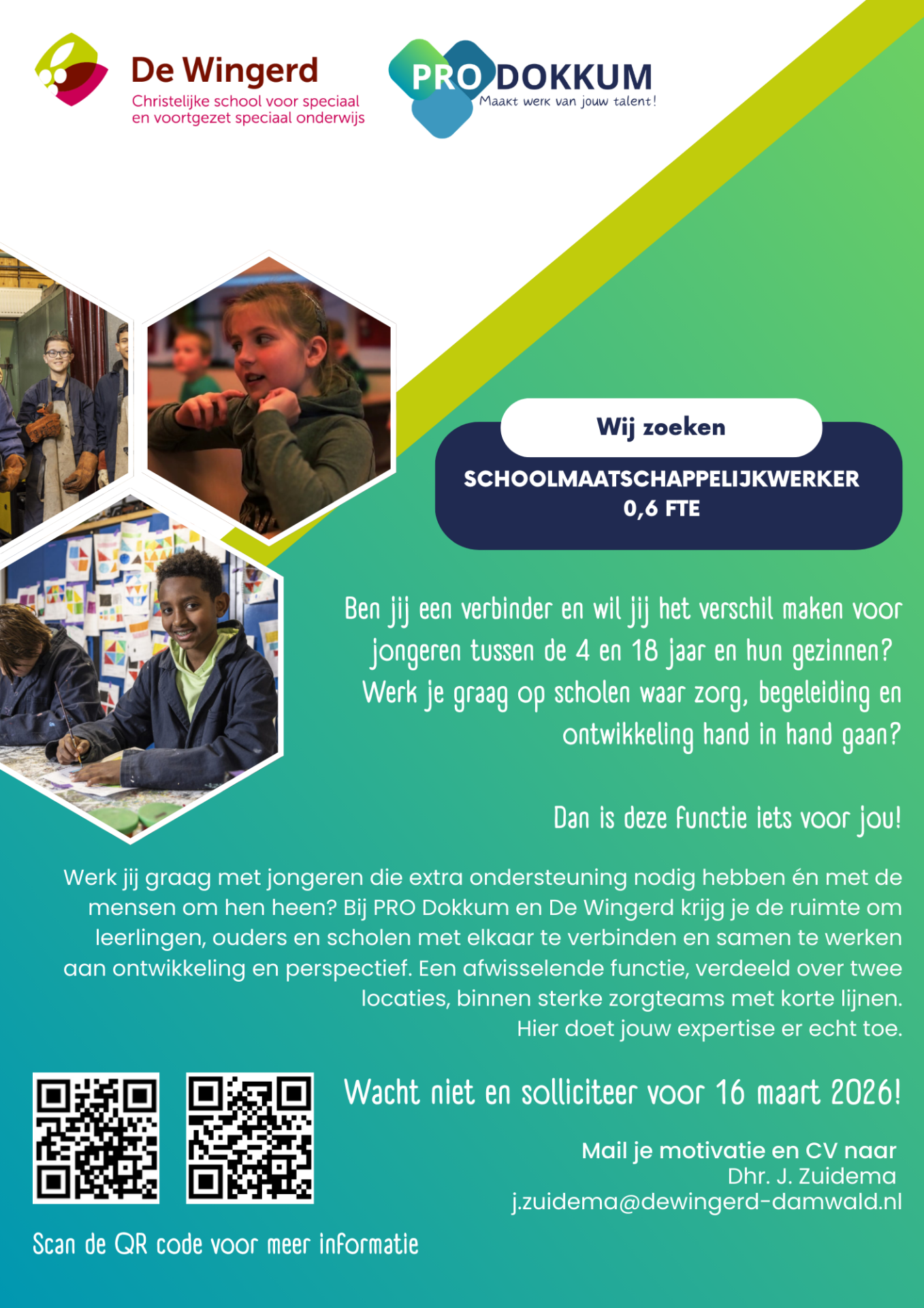 Ben jij een betrokken schoolmaatschappelijk werker die graag werkt met jongeren en hun ouders die extra ondersteuning nodig hebben? Wil je jouw expertise inzetten binnen twee onderwijsomgevingen waar zorg, begeleiding en ontwikkeling centraal staan? Dan zijn wij op zoek naar jou.